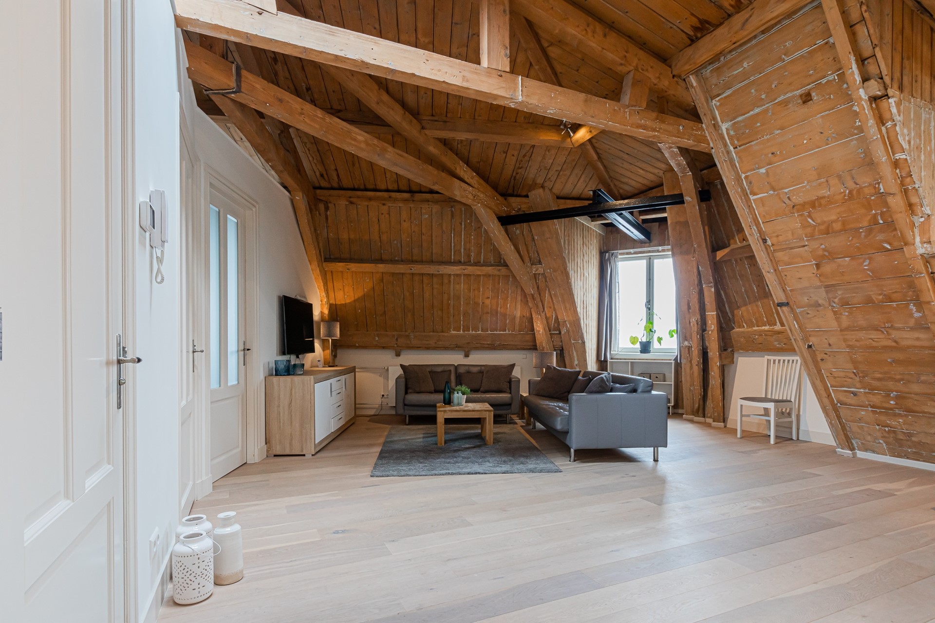 Third floor: spacious and bright living room at the front, modern open kitchen (with various built-in appliances), 2 bedrooms, modern bathroom with shower and sink, separate toilet, separate laundry with washing machine.