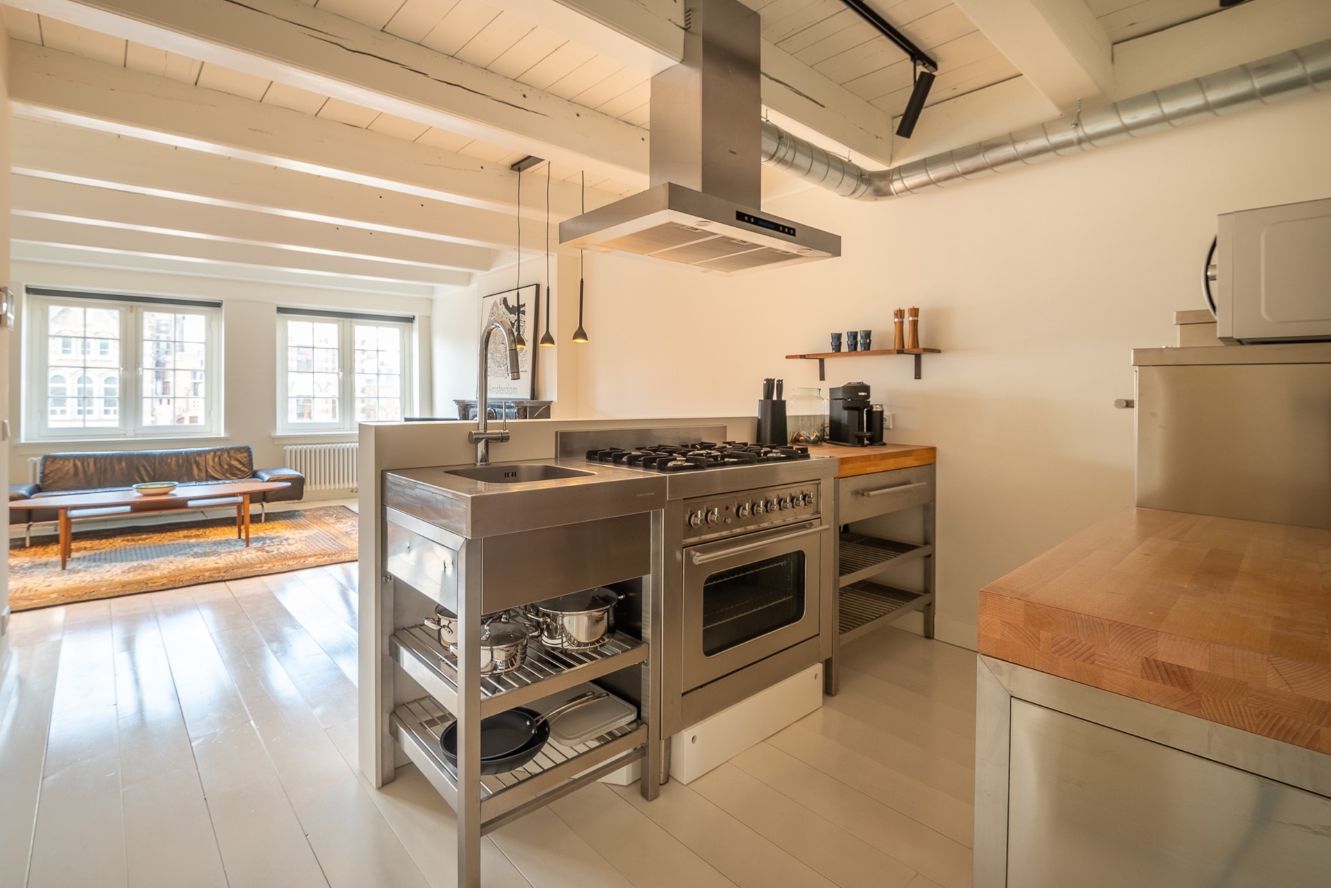 Entrance, spacious living room at the front with an open industrial kitchen (with various built-in appliances), separate toilet, spacious bedroom at the quiet rear, bathroom with shower and sink, separate space with wachingmachine and dryer.