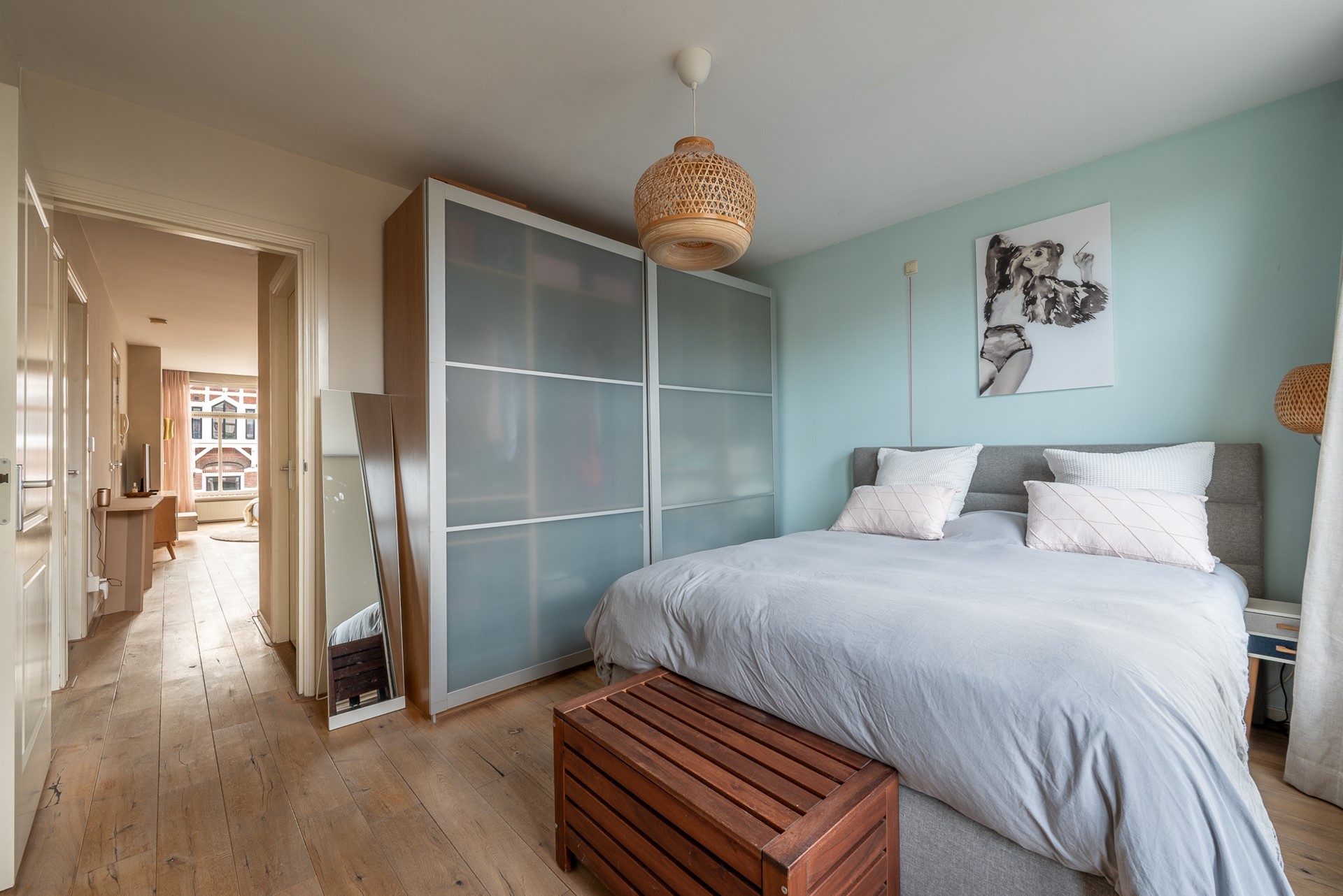 Aan de achterzijde van de woning bevinden zich de aparte, moderne keuken, uitgerust met alle benodigde inbouwapparatuur, en de royale master bedroom. Vanuit de slaapkamer is er directe toegang tot het balkon op het noordwesten, een fijne plek om in de middag- en avondzon te genieten.
