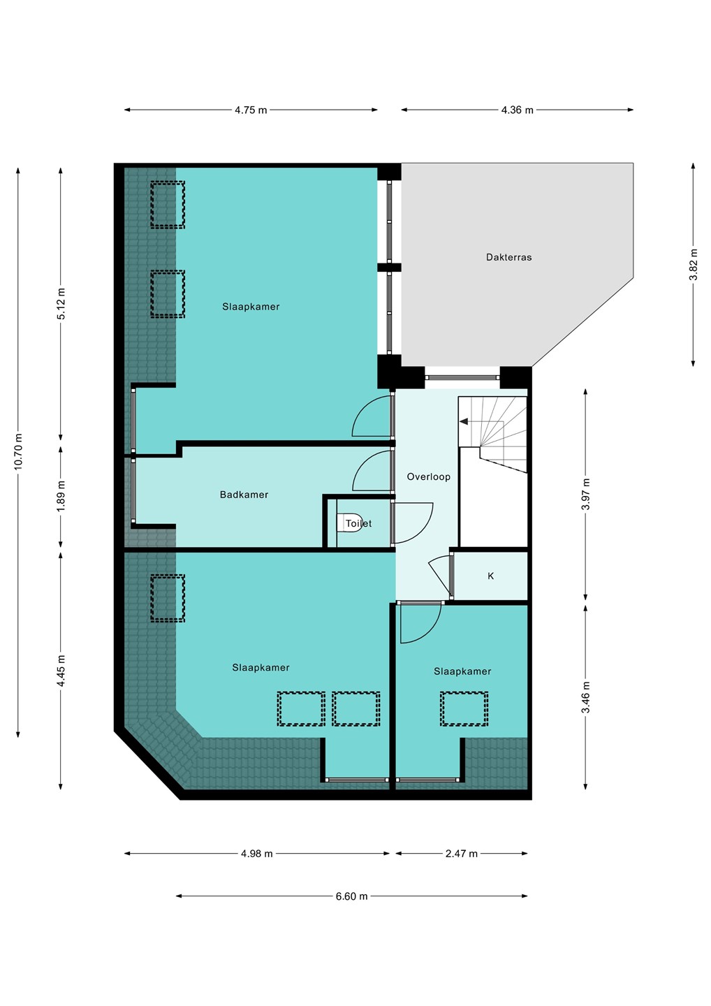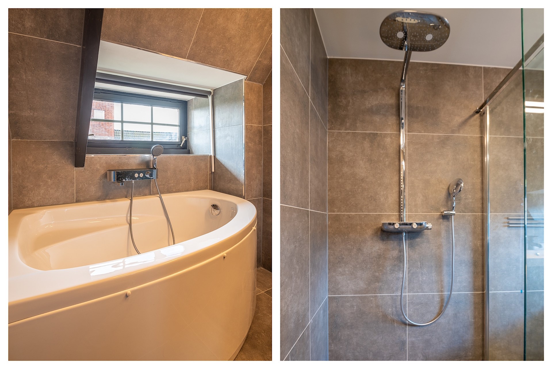 Derde verdieping: hal, 3 slaapkamers, 2e badkamer (v.v. ligbad, aparte douche en dubbele wastafel), apart toilet, zonnig dakterras