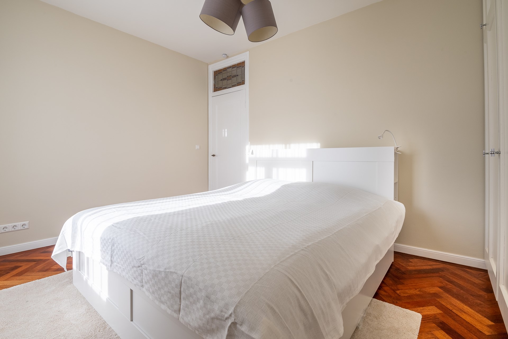 Entree, hal met toegang tot alle vertrekken, apart toilet, ruime slaapkamer aan de voorzijde met openslaande deuren naar het balkon, moderne badkamer v.v. ligbad met douche, en wastafel, tweede ruime slaapkamer (ook perfect als kantoor) aan de achterzijde, woonkamer ensuite (met originele glas-in-lood deuren) met aan de achterzijde openslaande deuren naar het balkon, moderne keuken v.v. diverse inbouw apparatuur.