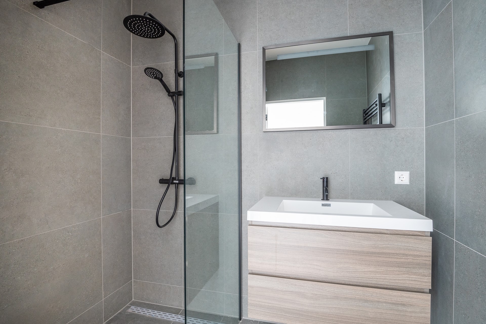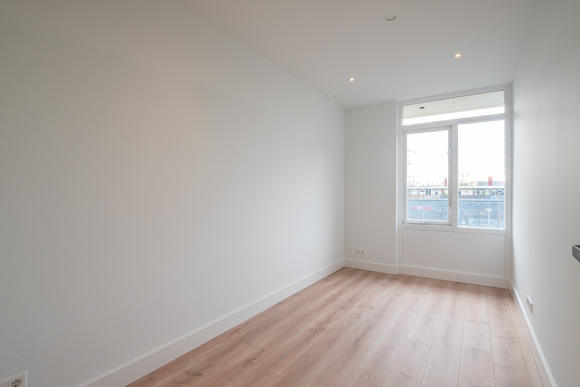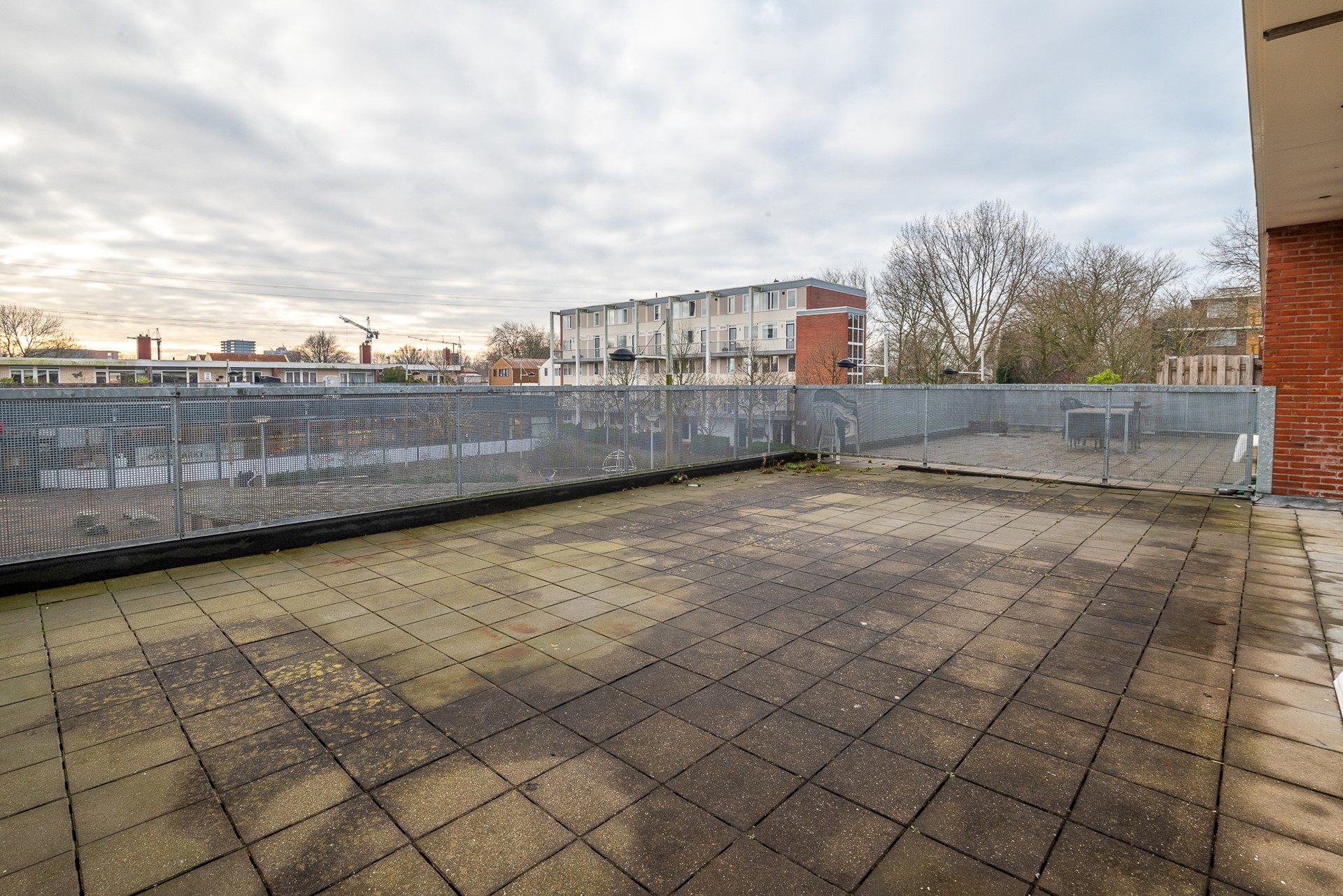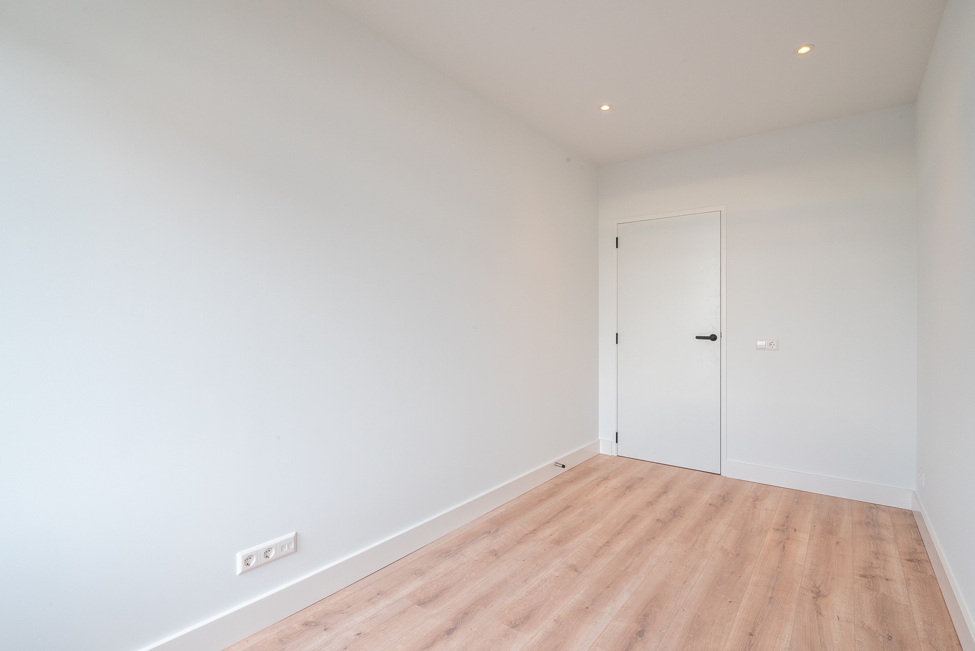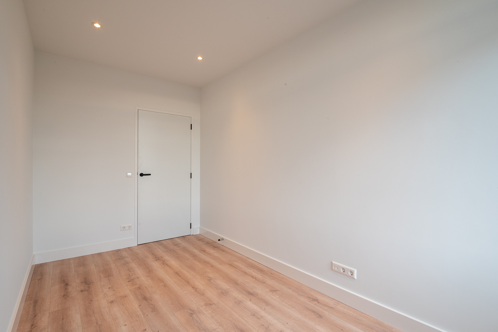 Eerste verdieping: entree met hal en toiletruimte, moderne badkamer v.v. inloopdouche en wastafel, ruim opgezette en lichte woonkamer met toegang tot het zeer ruime dakterras, moderne open keuken, drie goed bemeten slaapkamers. Washok met aansluitingen voor wasmachine en droger.
