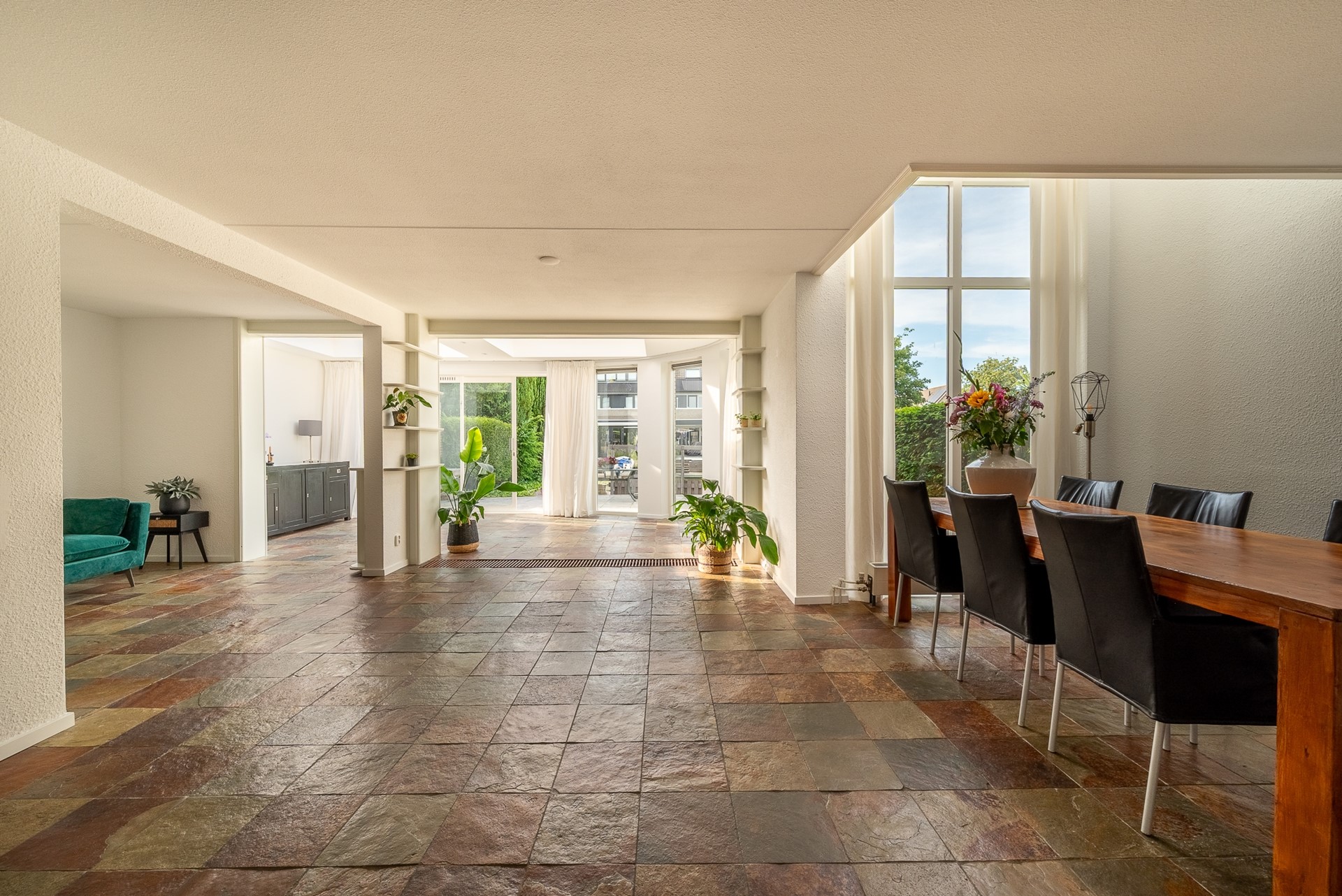 Ruime entree met toegang tot de aangebouwde stenen garage (14 m²), apart toilet, praktische trapkast en een royale woonkamer van ca. 50 m² met een prachtige serre voorzien van grote ramen voor maximale lichtinval. De moderne open keuken is uitgerust met hoogwaardige apparatuur van topmerken zoals Miele en Gaggenau. Openslaande deuren geven direct toegang tot de zonnige tuin aan het water.